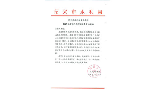 我公司荣获绍兴市水利局“2015年度优胜施工企业”称号
