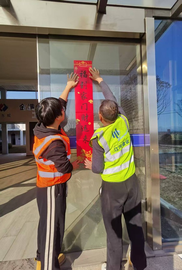 贴春联环节同样热闹非凡。大家手持红联,相互协作,小心翼翼地将春联贴在项目部大门上,红红的春联在阳光下格外醒目,为钢筋水泥的工地增添了浓浓的节日喜庆,也让“以工地为家”的坚守者们感受到了扑面而来的年味儿。活动现场还设置了“福字送福”环节,一张张饱满喜庆的“福”字被职工们精心贴在门窗上,传递着“福满工地、福泽民生”的美好期许。